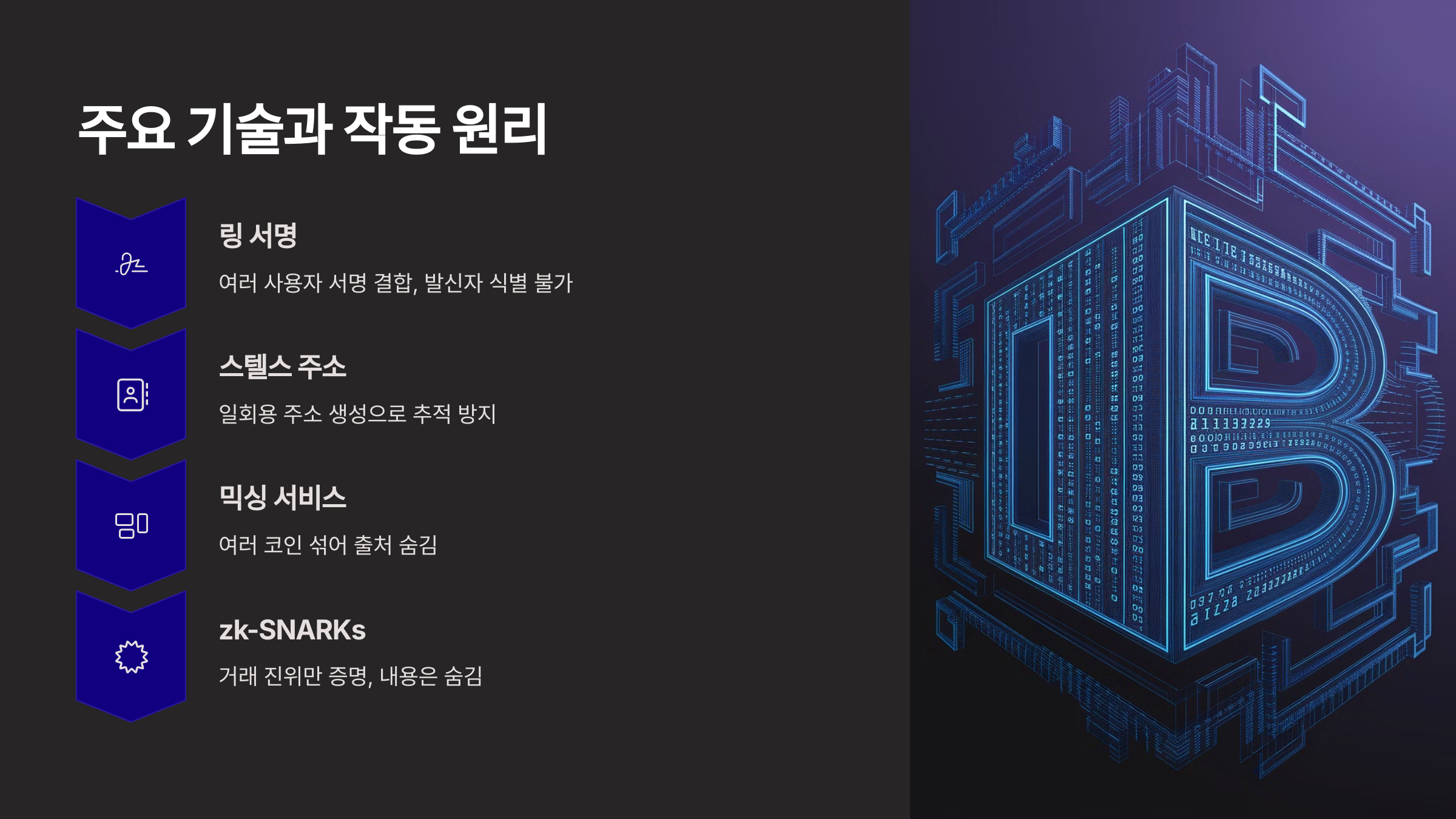 - 기술적 구현 방식: 링 서명(Ring Signature), 지갑 주소 혼합(Mixing), 지식증명(zk-SNARK) 등 다양한 방식 사용