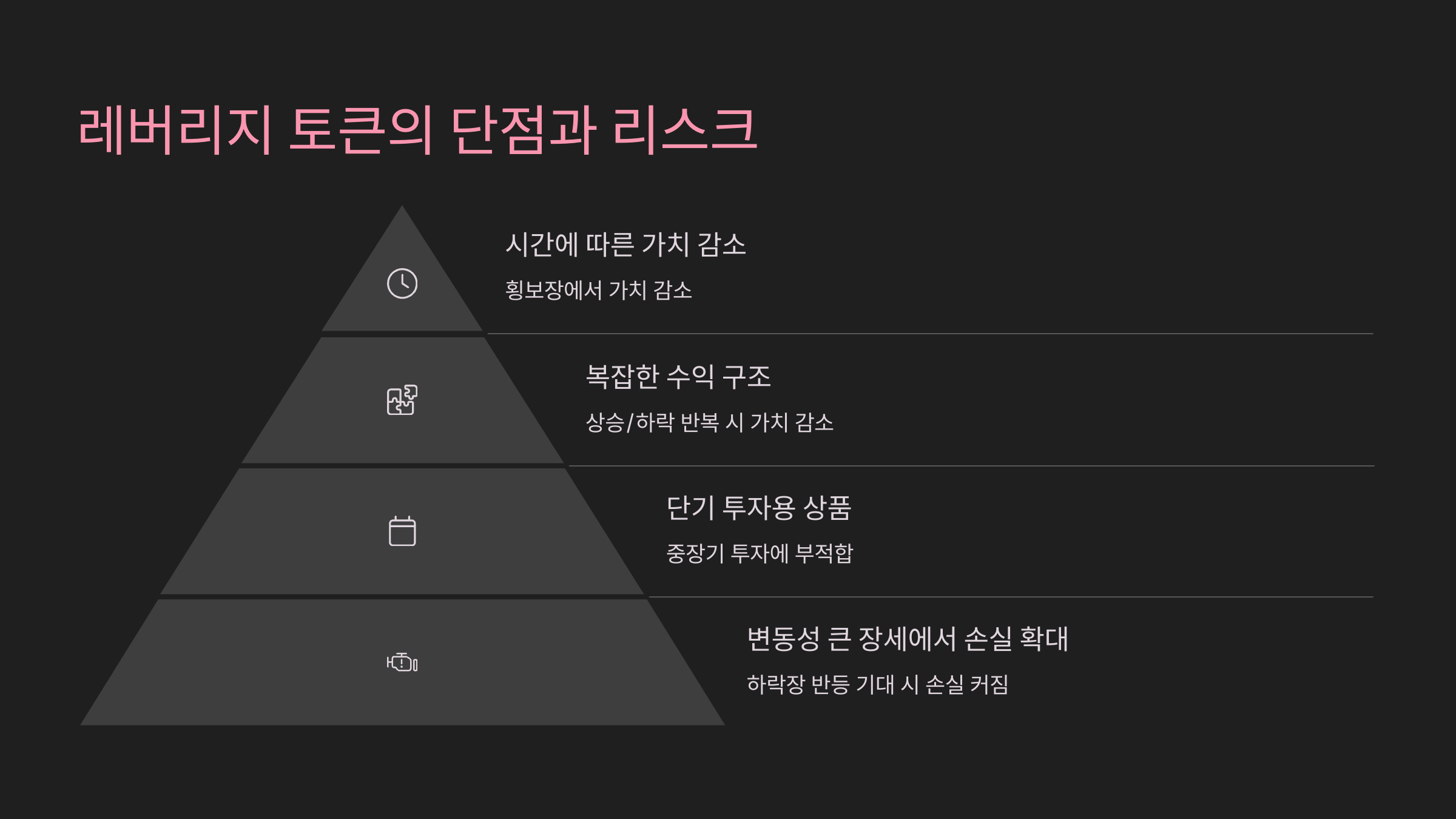 레버리지 토큰은 잘 활용하면 단기적으로 높은 수익을 가져다 줄 수 있는 강력한 무기입니다. 하지만 구조에 대한 이해 없이 접근하면, 작은 가격 변동에도 큰 손실로 이어질 수 있습니다.