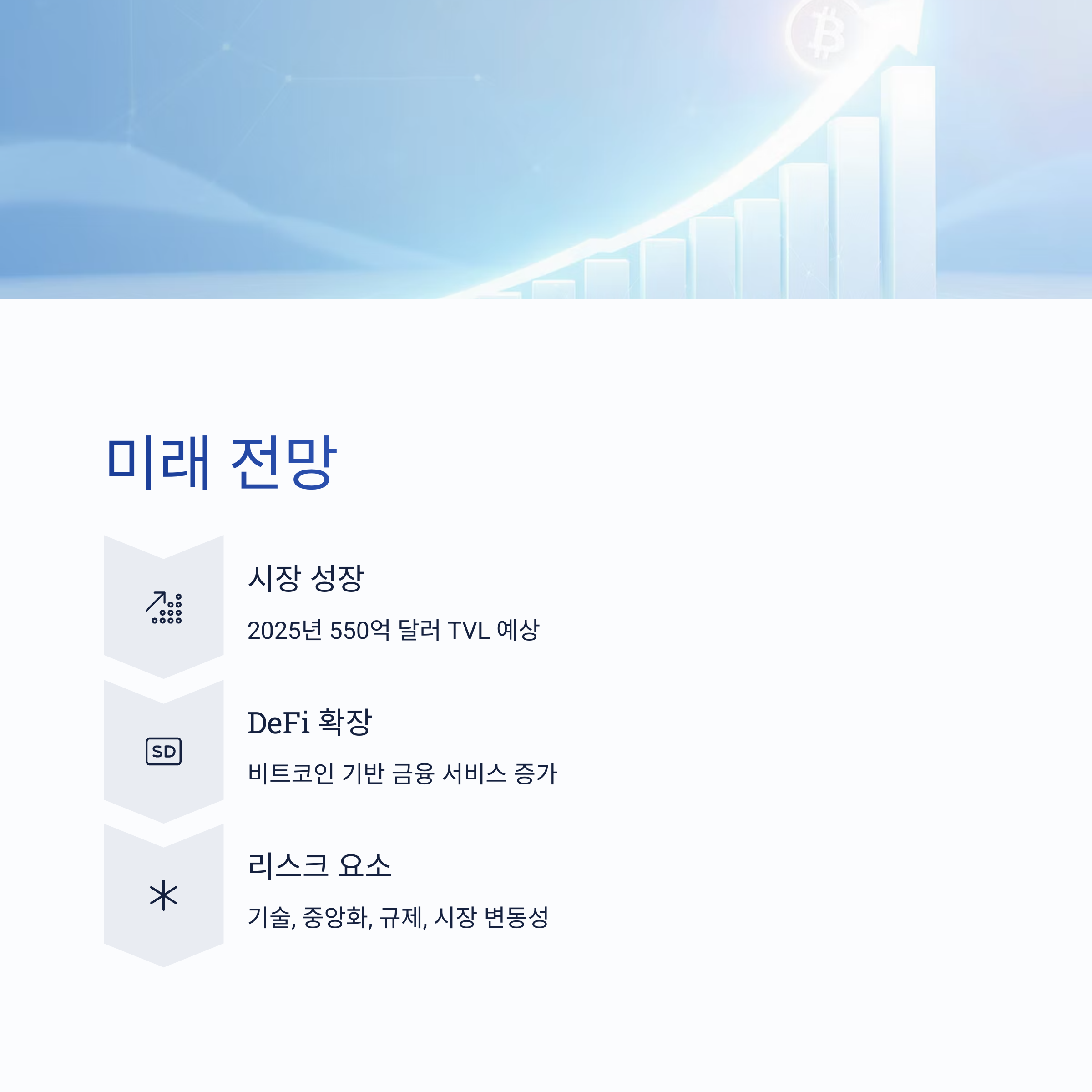 시장 분석가들은 2025년 비트코인 디파이(DeFi) 시장이 가장 주목받는 분야로 부상할 것으로 전망하고 있습니다. 특히 비트코인 스테이킹 TVL이 550억 달러를 넘어설 것으로 예상되며, 연간 3% 수익률만으로도 충분히 매력적인 투자 기회를 제공할 것으로 분석됩니다.