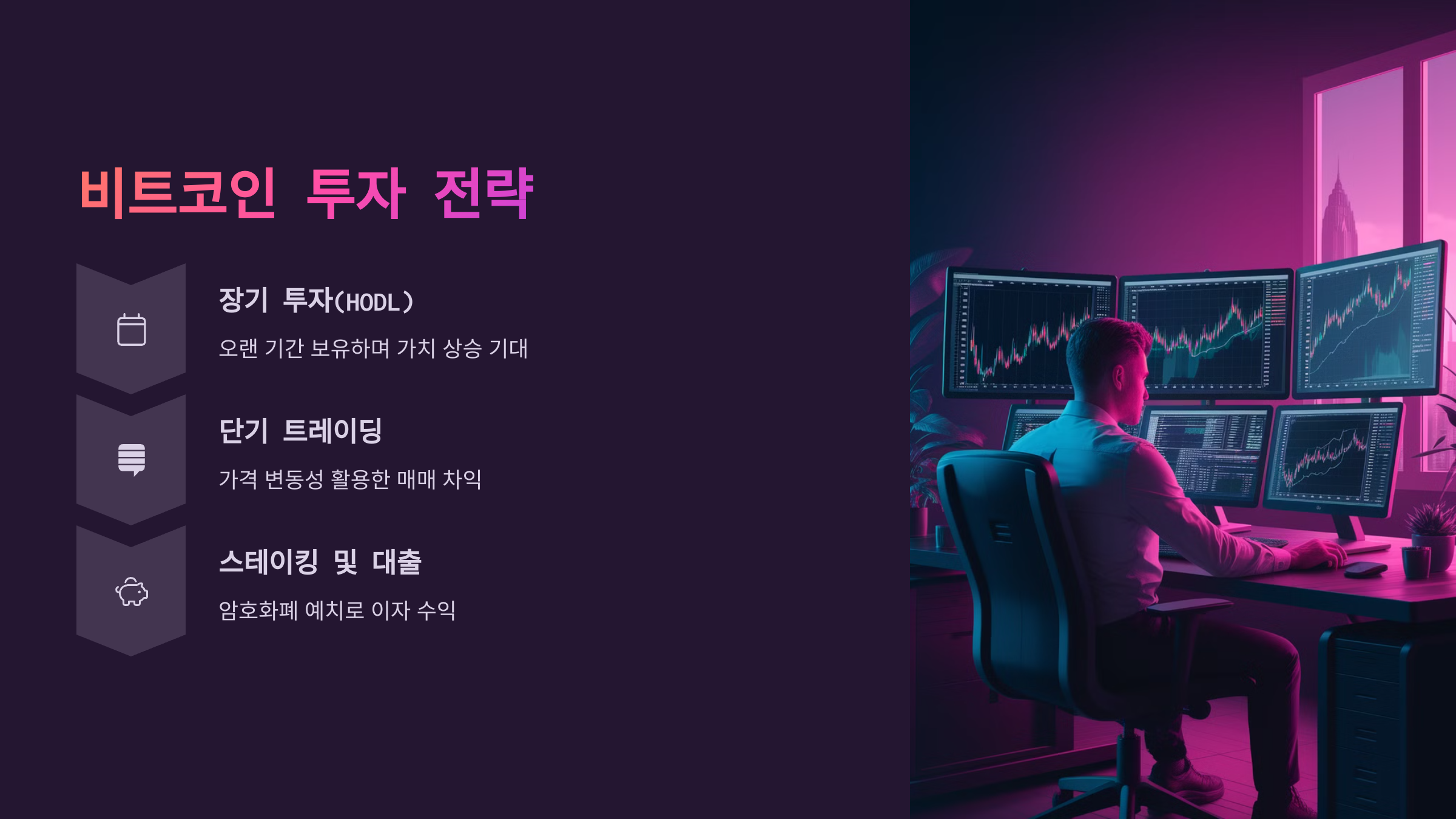 - 장기 투자(HODL): 비트코인을 오랜 기간 보유하면서 가치 상승을 기대하는 투자 방식