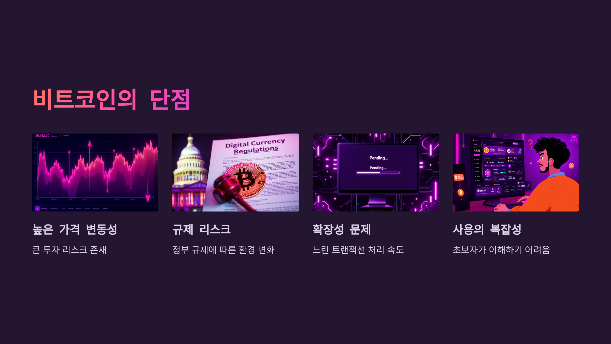 - 사용의 복잡성: 암호화폐 지갑 관리, 개인 키 보관 등 초보자가 이해하기 어려운 요소들이 존재합니다.