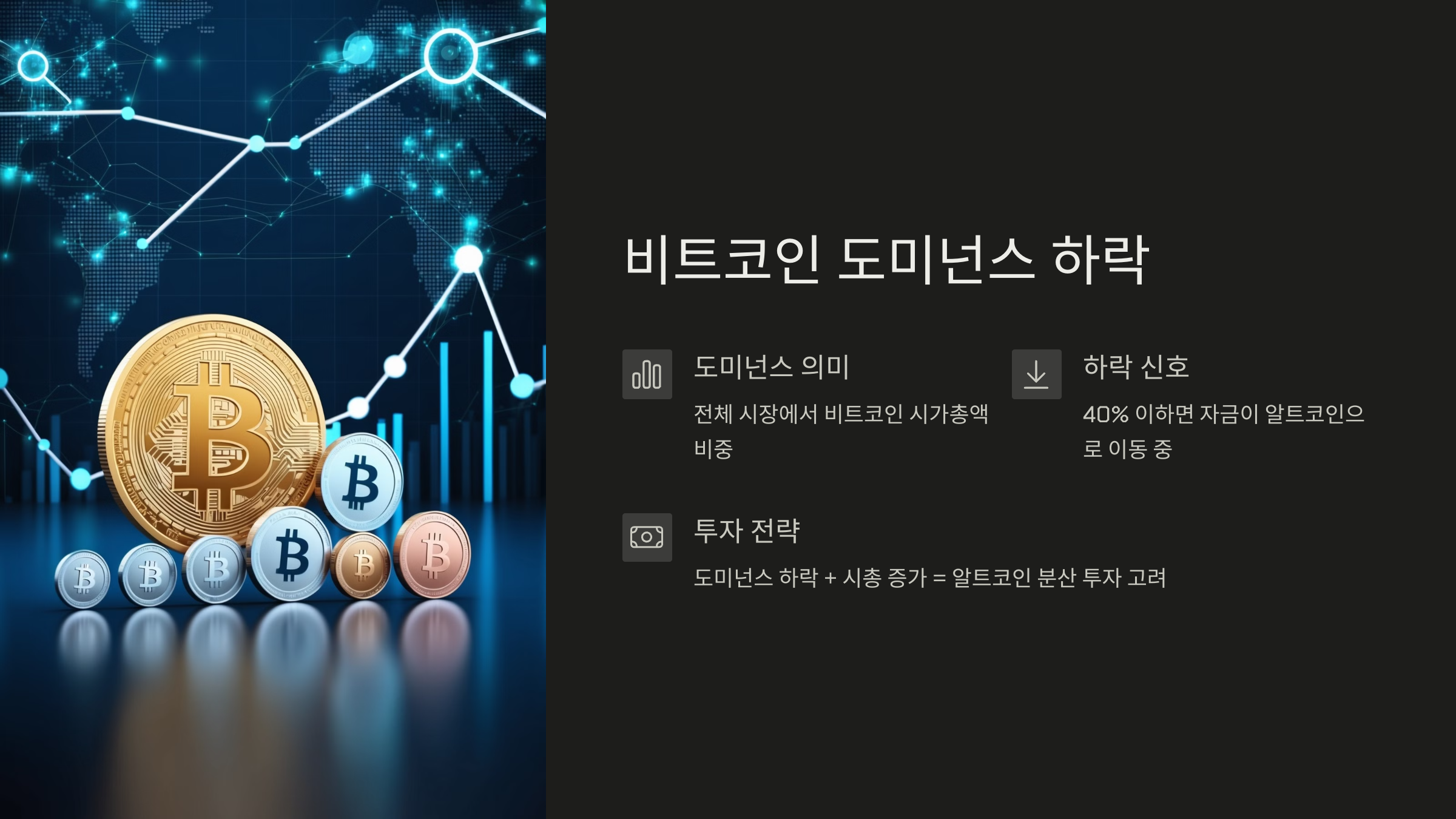 비트코인 도미넌스는 암호화폐 시장 전체에서 비트코인이 차지하는 시가총액 비중을 의미합니다. 이 비율이 60% 이상이면 비트코인이 시장을 지배하고 있는 상태이며, 반대로 40% 이하로 하락하면 자금이 알트코인으로 이동 중이라는 신호로 해석됩니다.