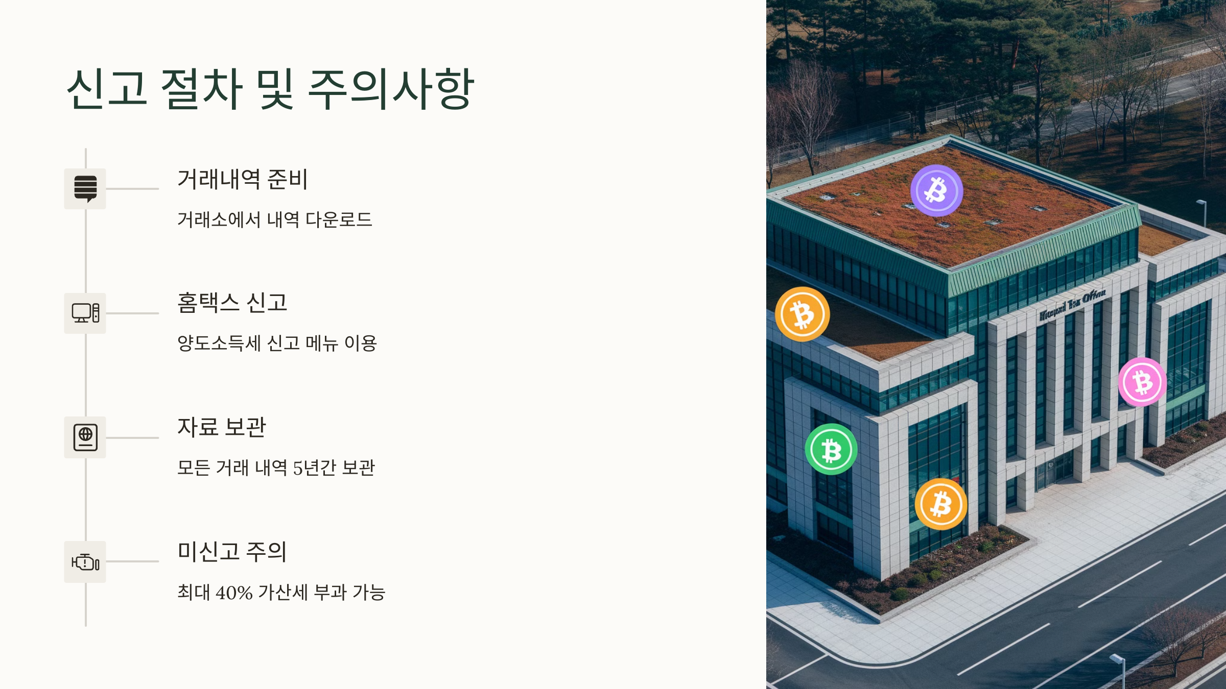 ❓ 암호화폐 세금 신고를 안 하면 어떻게 되나요? 👉 미신고 시 가산세 및 국세청 조사 대상이 될 수 있음.