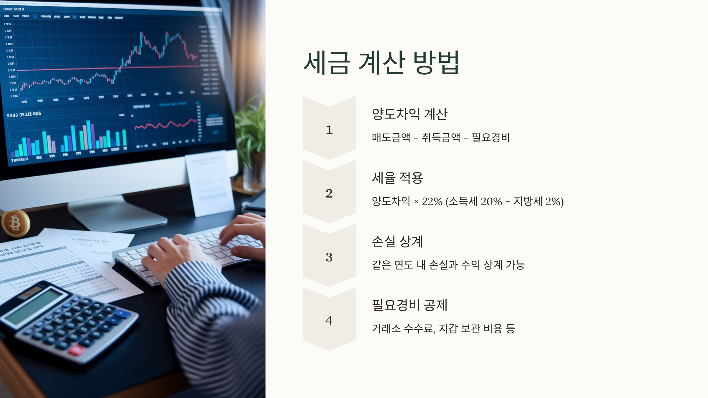 암호화폐 소득세는 양도소득세 방식으로 계산되며, 기본 세율은 **22% (소득세 20% + 지방세 2%)**입니다.