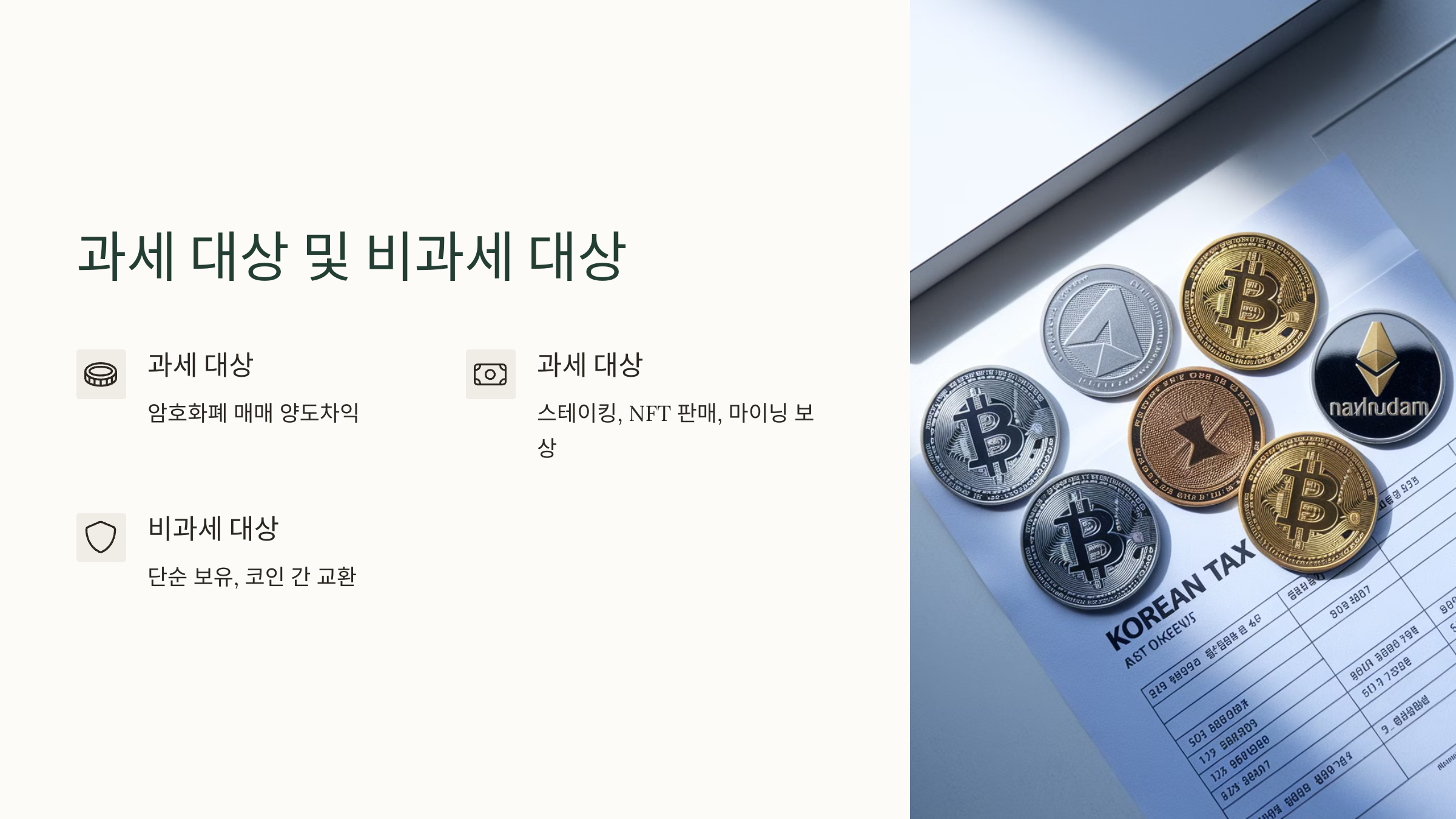 📌 과세 대상 거래 ✅ 암호화폐 매매로 인한 양도차익 ✅ 스테이킹(Staking) 및 디파이(DeFi) 이자 수익 ✅ NFT 판매 수익 ✅ 암호화폐로 받은 급여 또는 보상 ✅ 마이닝(채굴) 보상