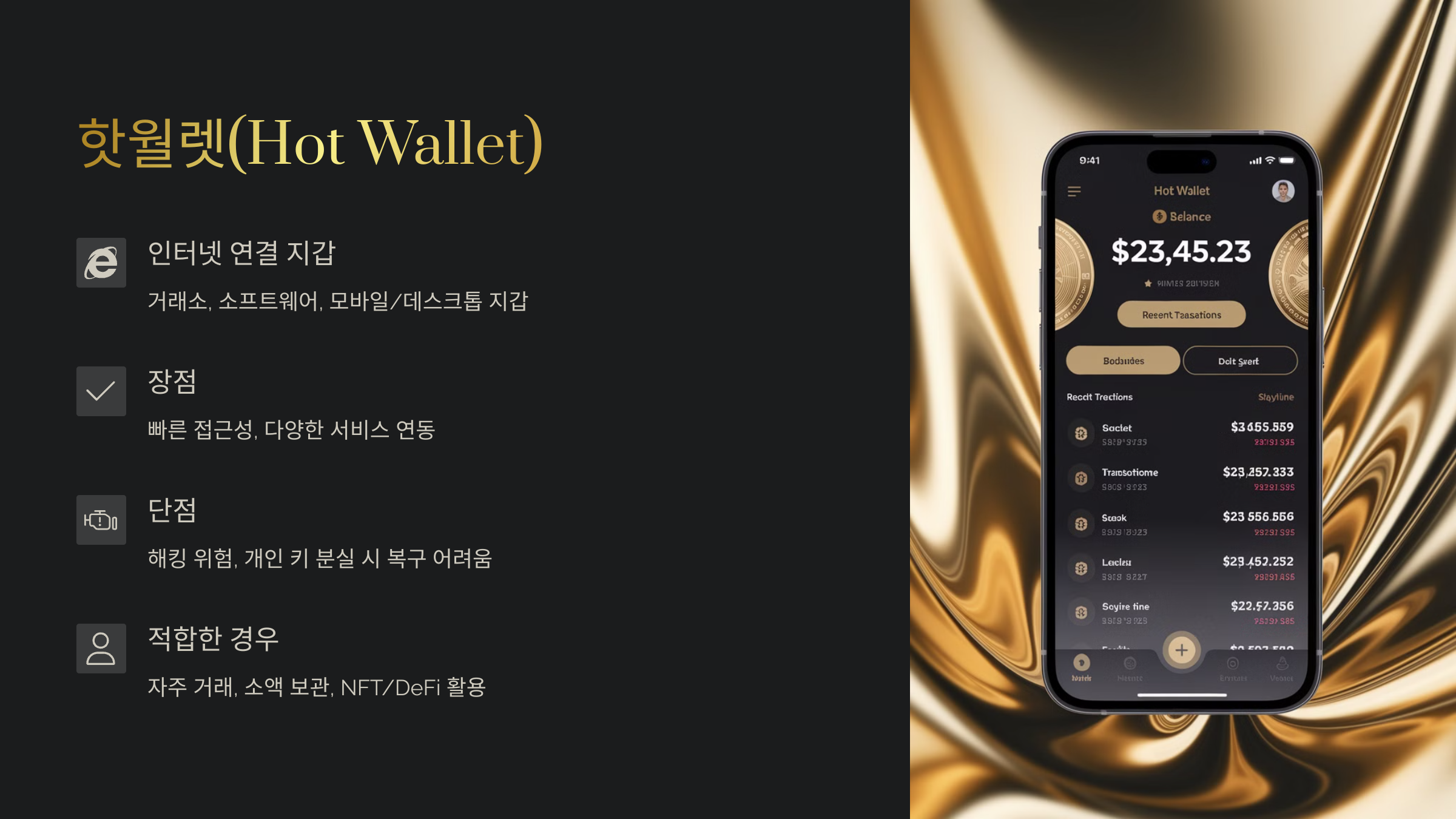 ✅ 핫월렛은 인터넷에 연결된 암호화폐 지갑으로, 거래소 지갑과 모바일/데스크톱 지갑이 포함됩니다.