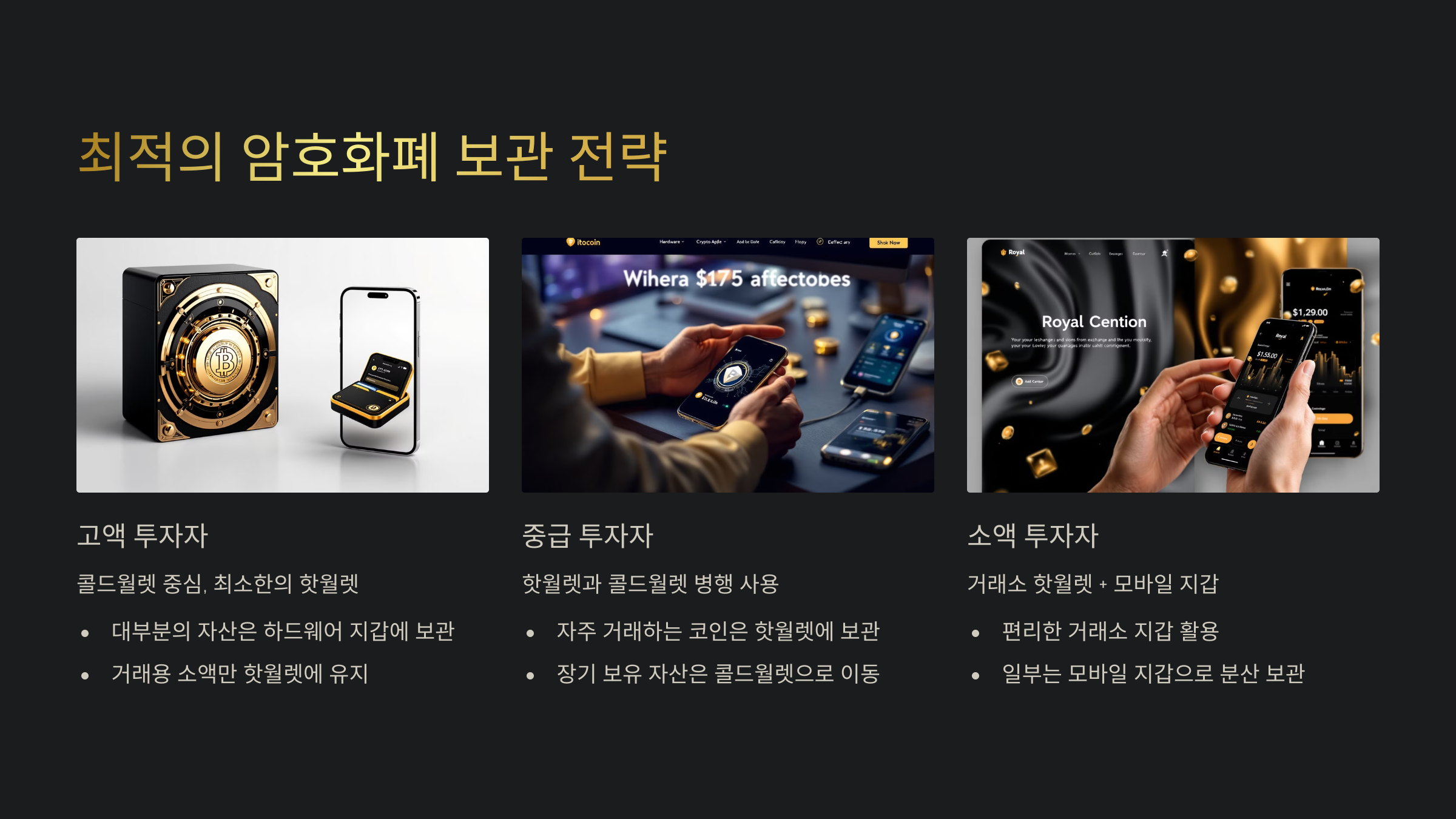 - 소액 투자자: 거래소 핫월렛 + 모바일 소프트웨어 지갑
