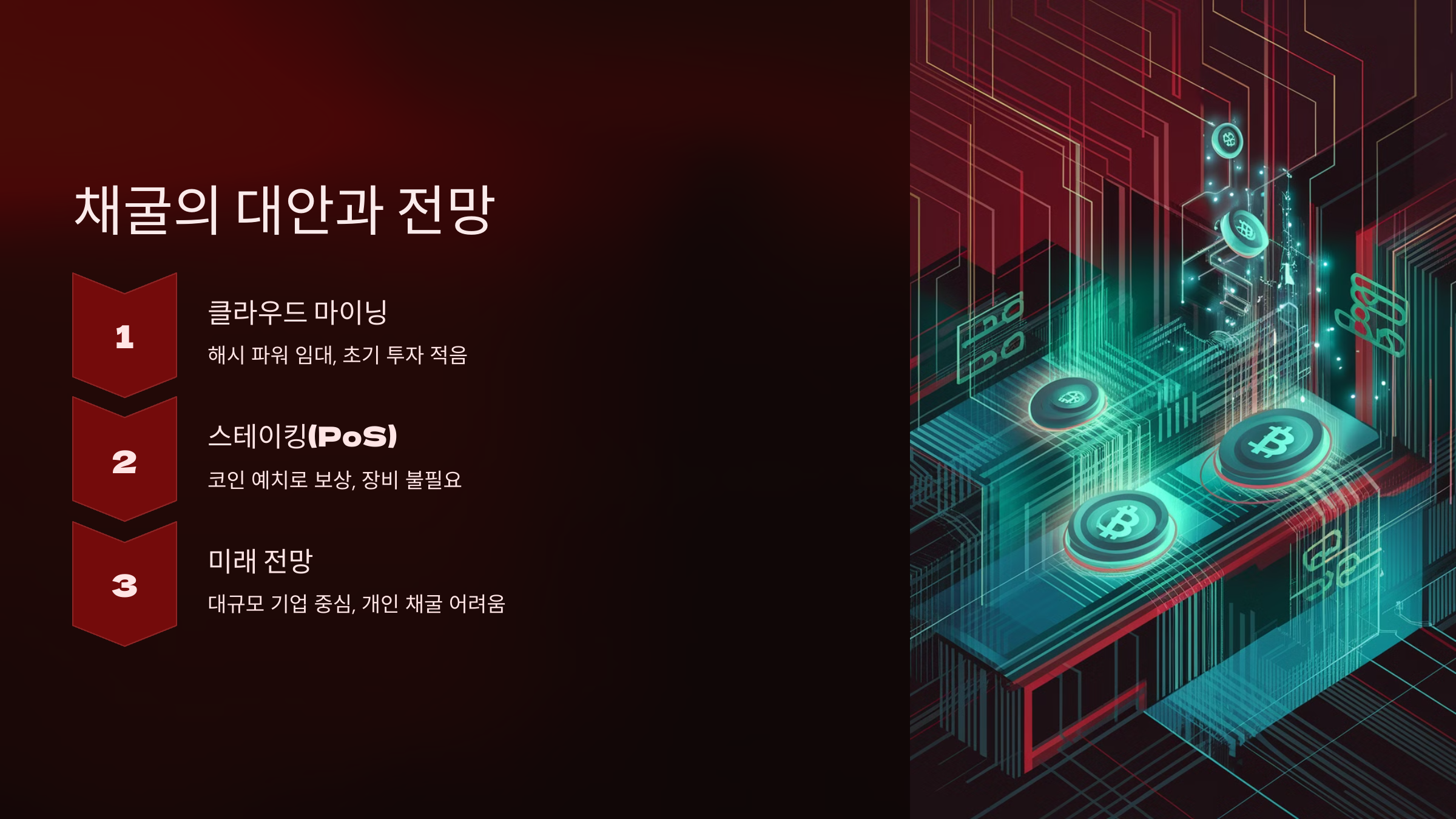 📌 결론: 개인 채굴자라면 직접 채굴보다는 클라우드 마이닝이나 스테이킹을 고려하는 것도 방법.