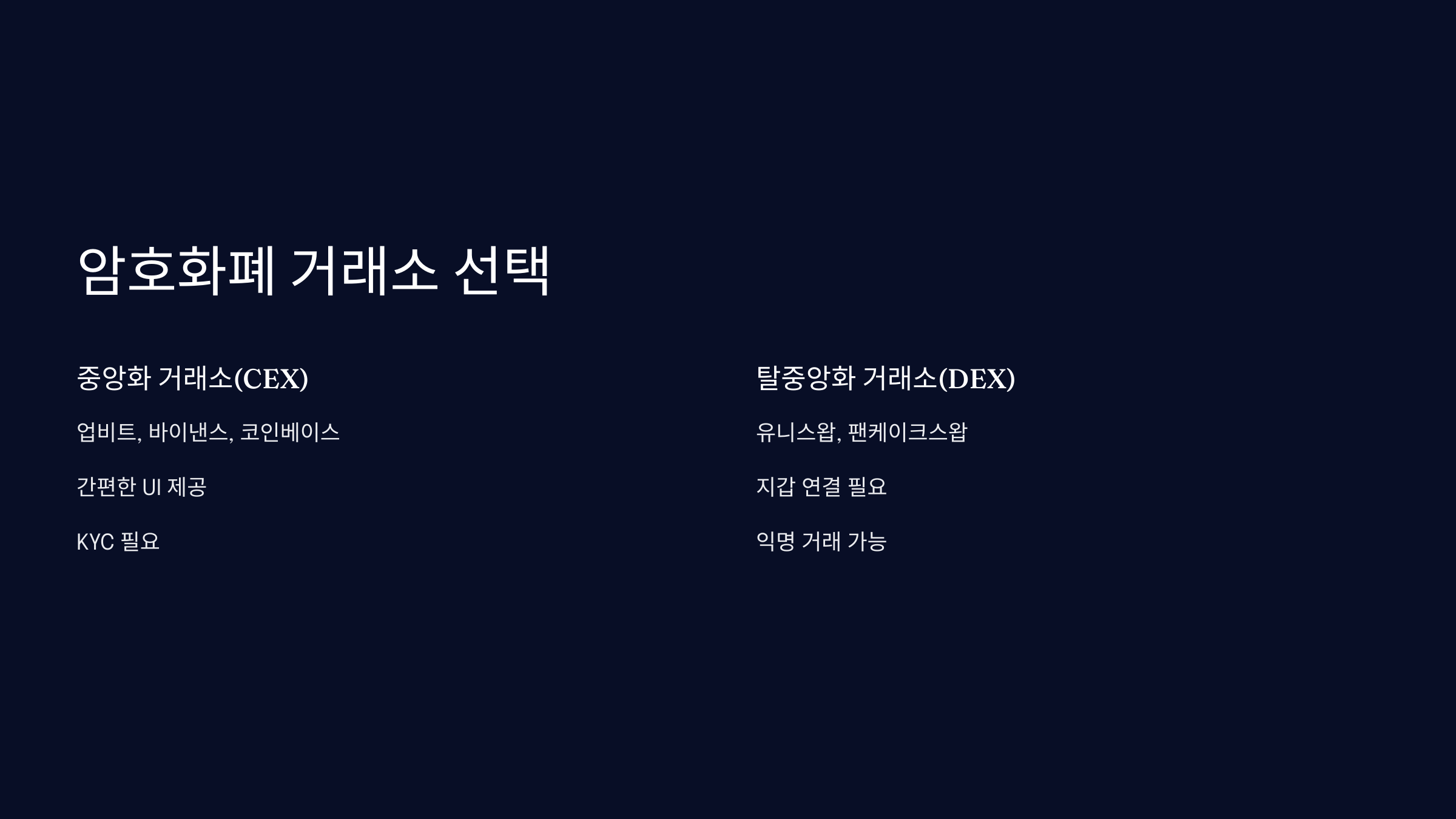 | 예시 | 업비트, 바이낸스, 코인베이스 | 유니스왑, 팬케이크스왑 |