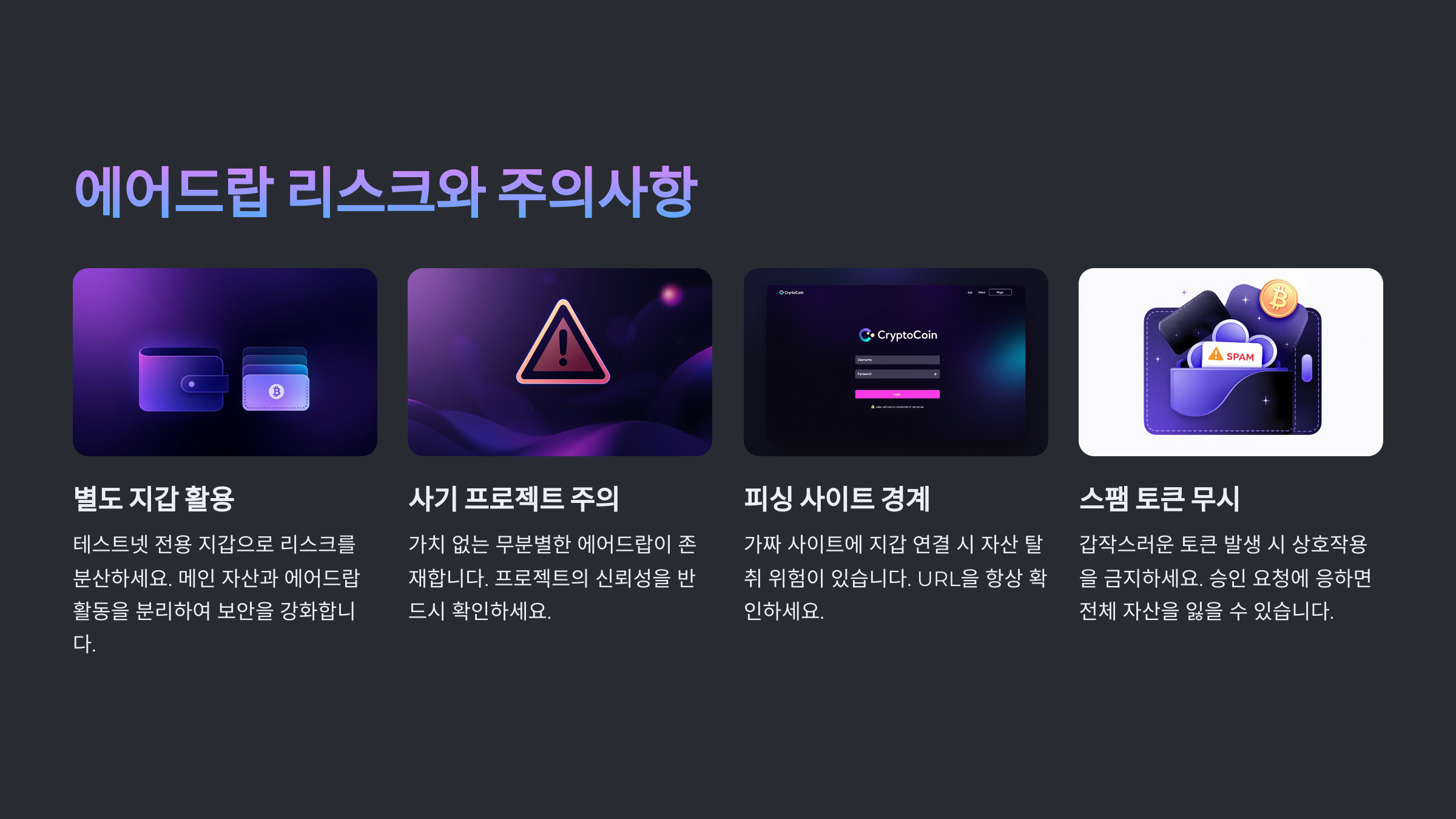 - 토큰 가치가 전혀 없는 무분별한 에어드랍 시도 존재