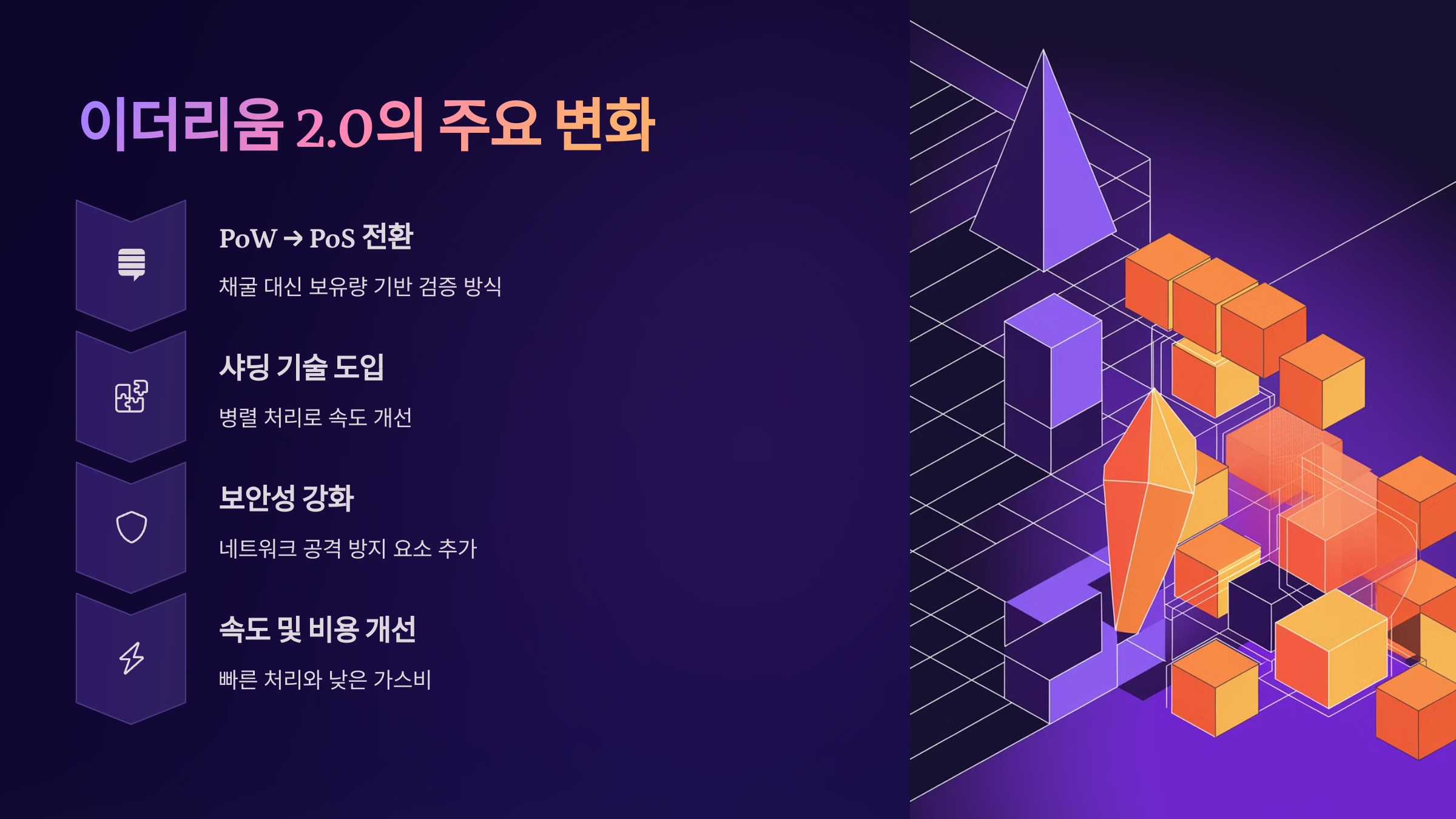 ✅ PoW → PoS 전환: 기존의 채굴 방식 대신 이더리움을 보유한 사용자가 네트워크의 보안과 검증에 참여하는 방식으로 변경됩니다. ✅ 샤딩 기술 도입: 트랜잭션을 여러 개의 작은 데이터 블록으로 나누어 병렬적으로 처리할 수 있도록 하여 속도를 개선합니다. ✅ 더욱 강력한 보안성: 네트워크 공격을 방지하기 위해 여러 보안 강화 요소가 추가되었습니다. ✅ 거래 속도 및 비용 개선: 트랜잭션 처리 속도가 빨라지고, 가스비(거래 수수료)가 낮아질 것으로 기대됩니다.