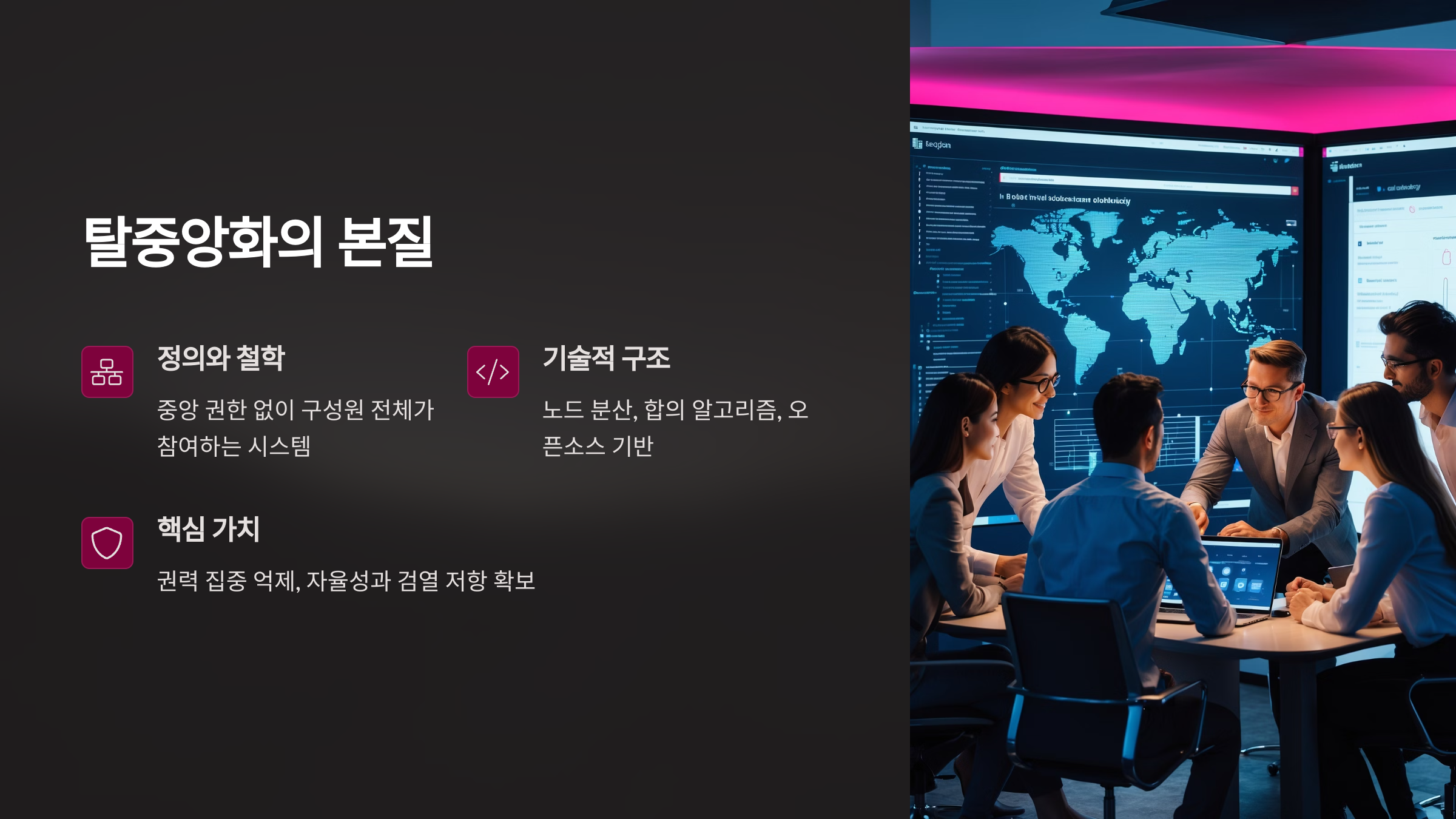 - 중앙 권한 없이 구성원 전체가 운영/검증/결정에 참여하는 시스템 구조