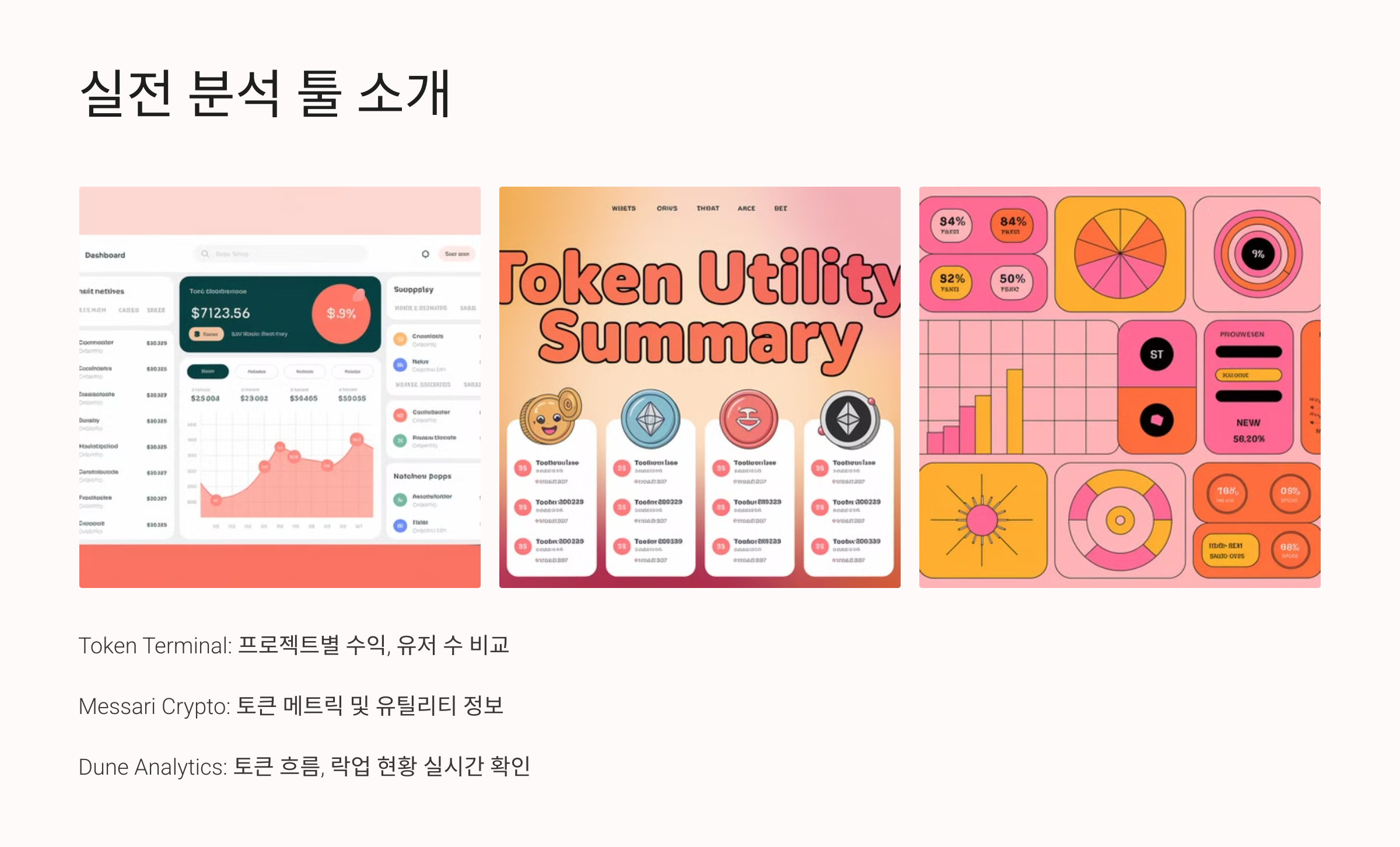 - Token Terminal: 프로젝트별 수익, 유저 수, 토큰 이코노미 구조를 비교 분석 가능