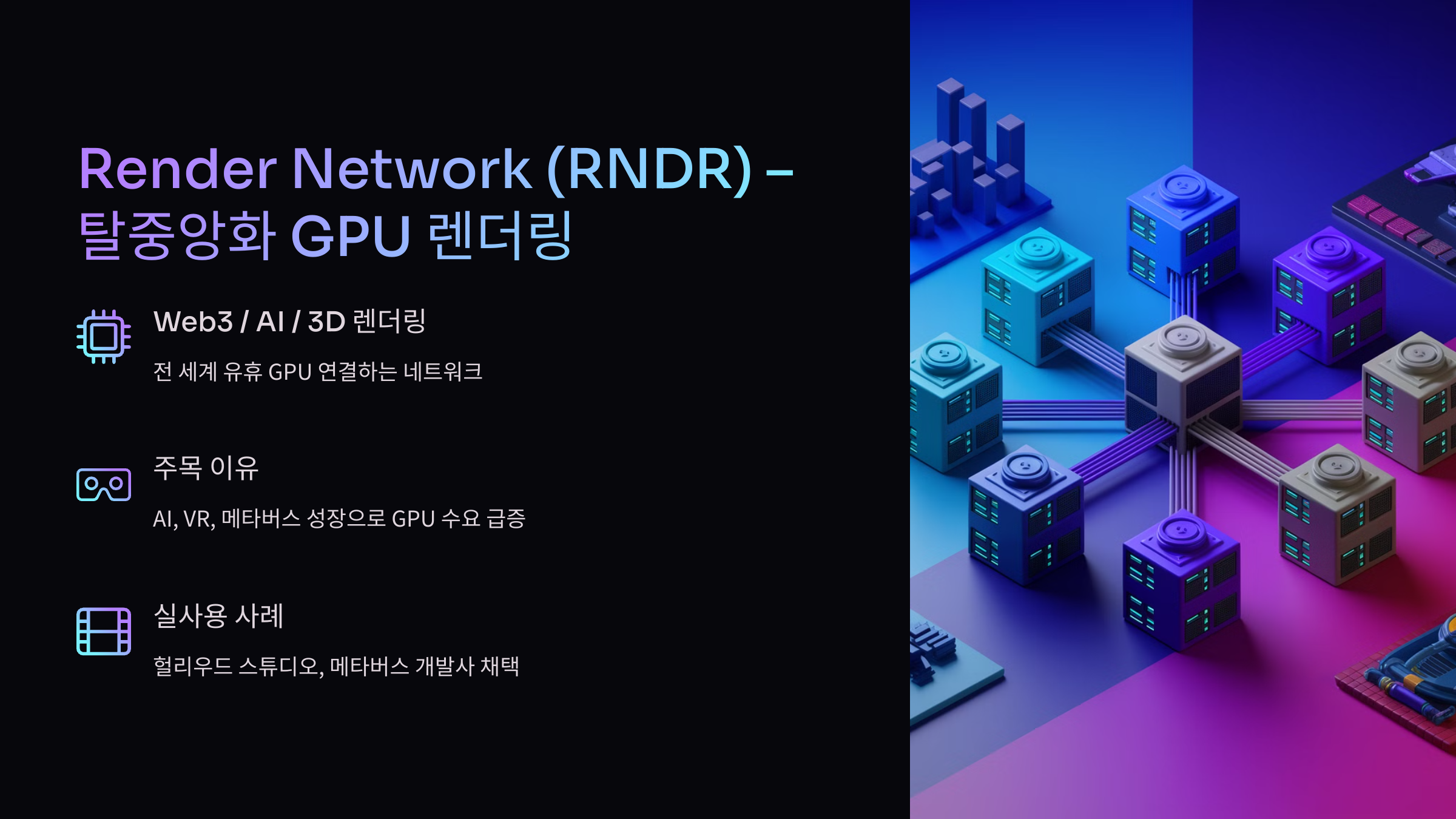 - 주요 특징: 전 세계 유휴 GPU를 연결하여 렌더링 파워를 공유하는 탈중앙화 네트워크