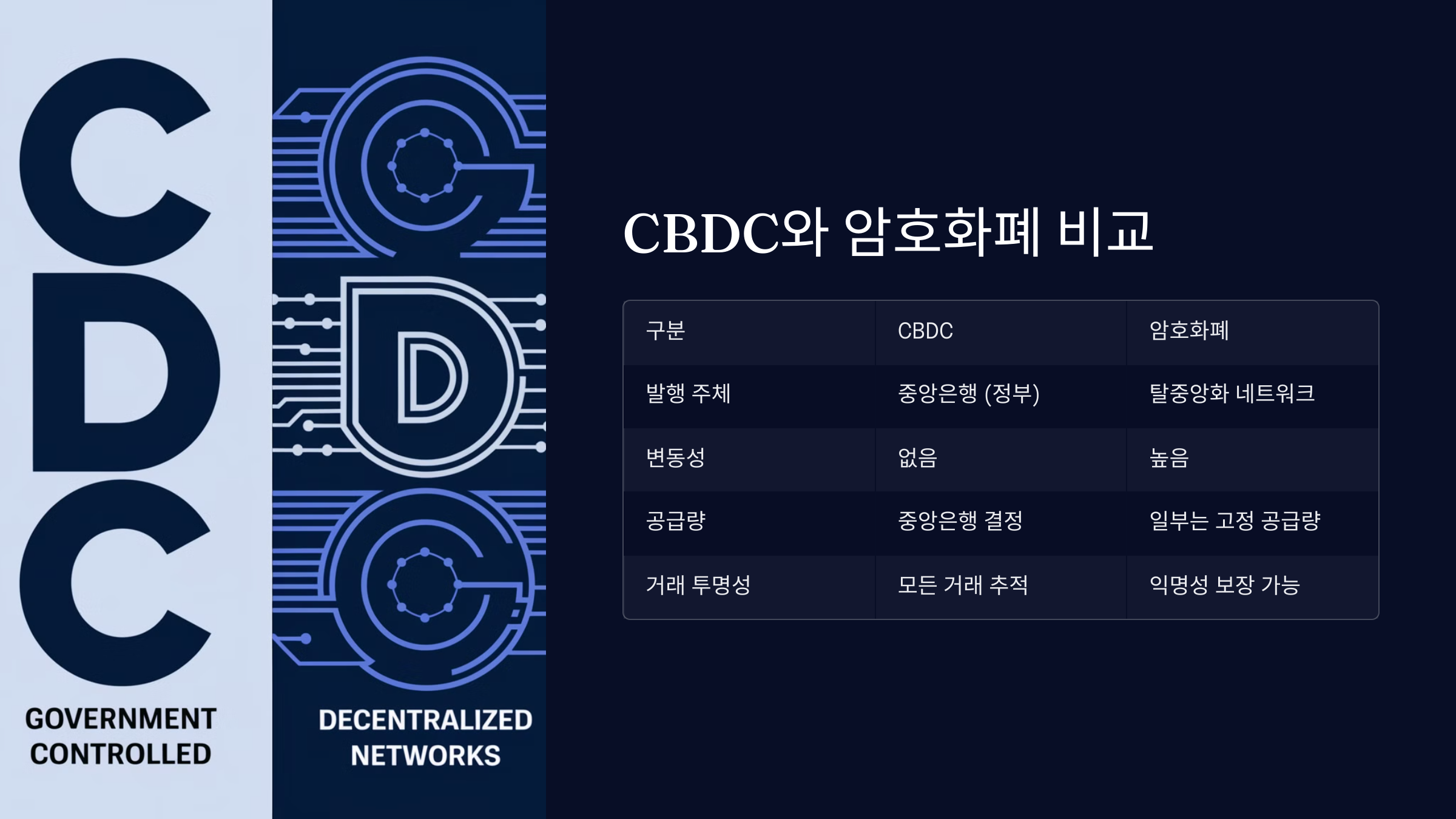 | 거래 투명성 | 중앙은행이 모든 거래를 추적 | 공개 블록체인에서 익명성 보장 가능 |