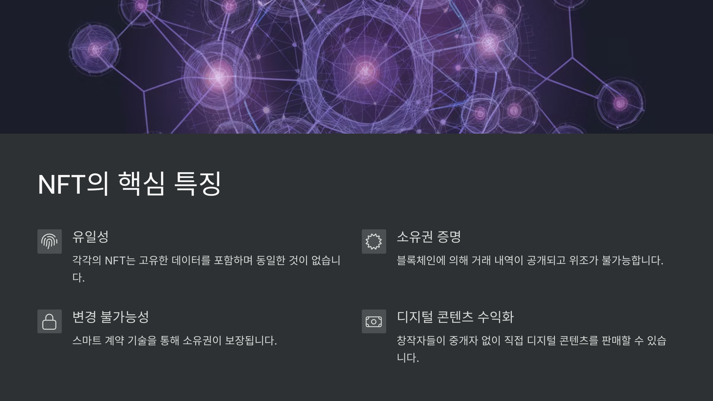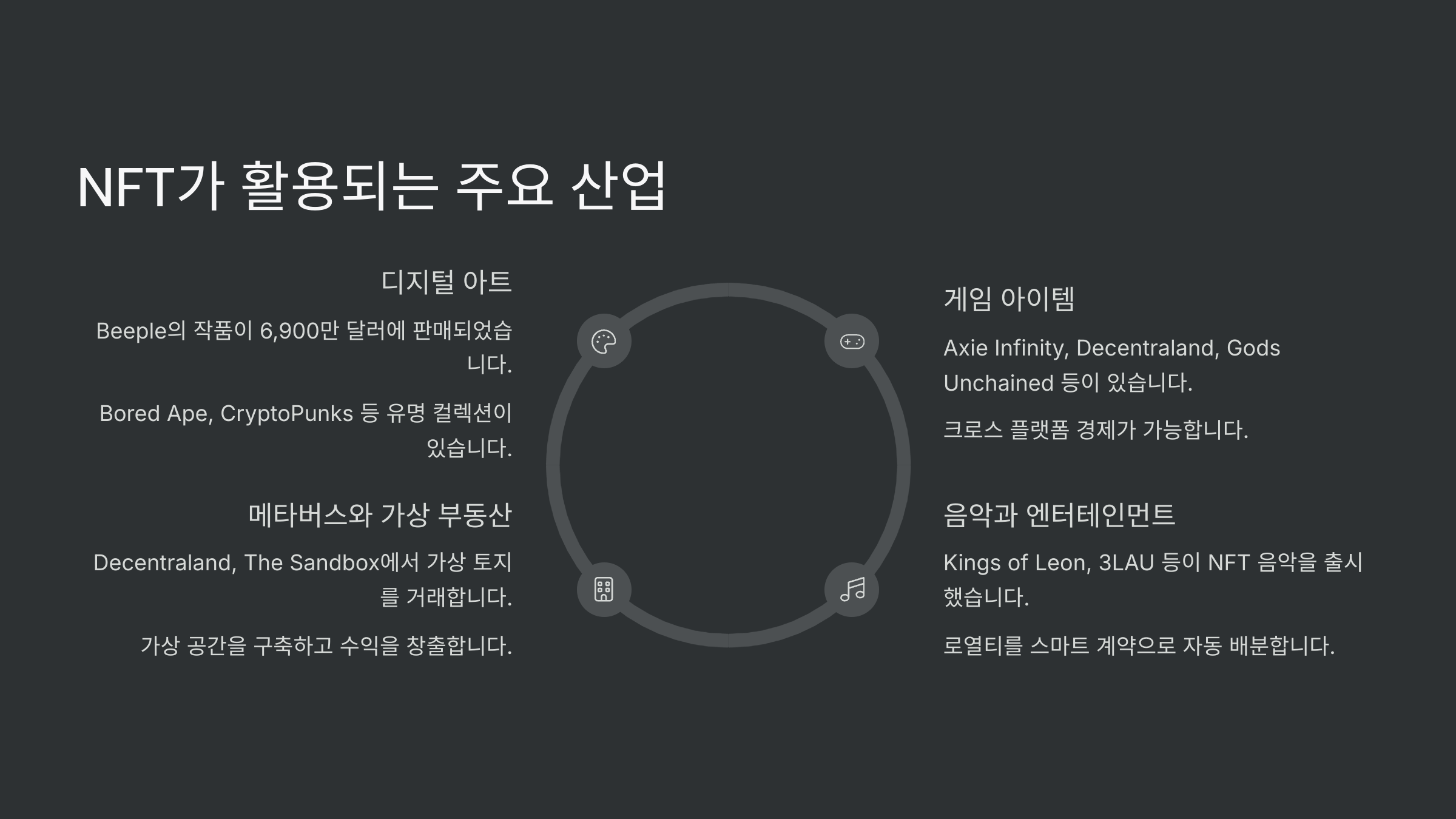 NFT는 예술, 게임, 음악, 부동산 등 다양한 분야에서 사용되며, 디지털 자산의 새로운 패러다임을 제시하고 있습니다.